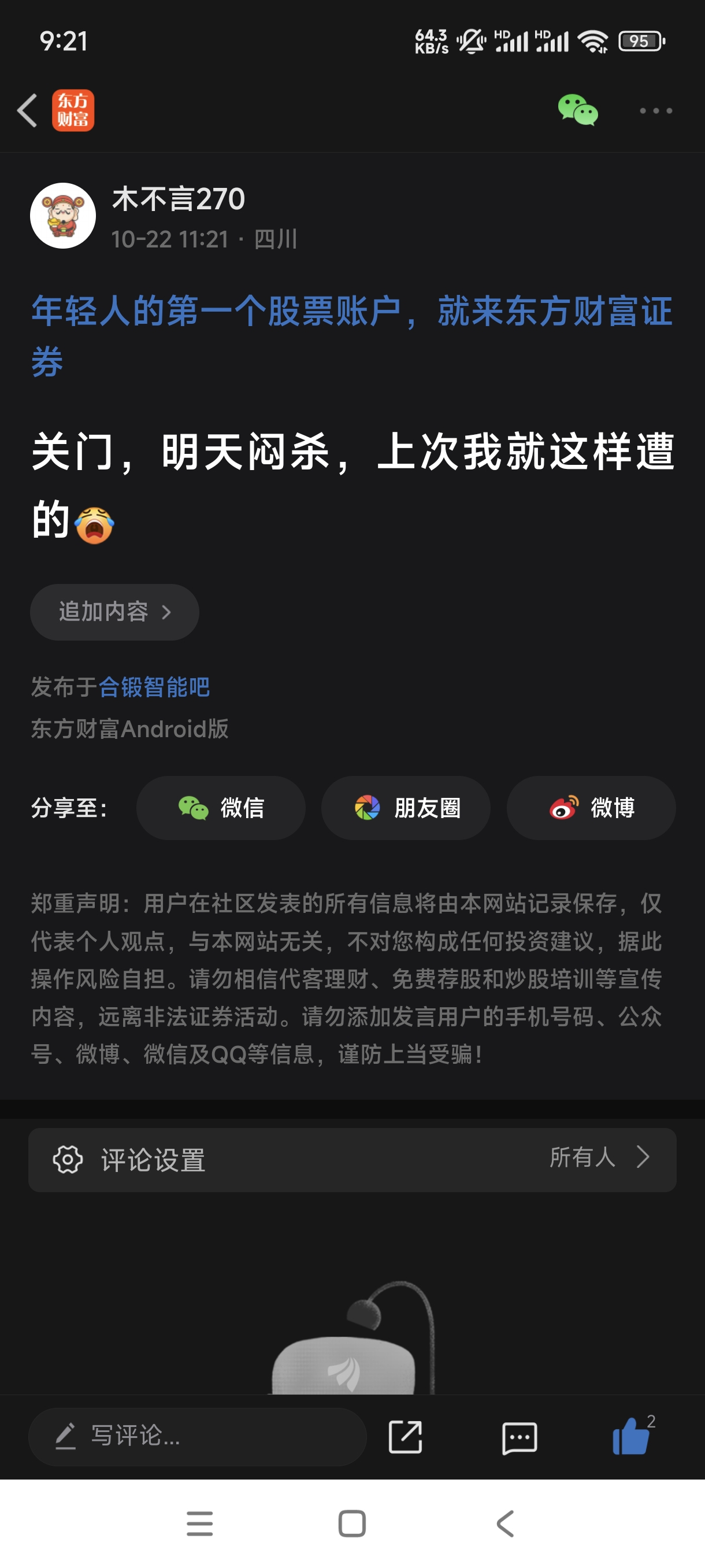 温馨提示: 1.根据《证券法》规定,禁止编造、传播虚假信息或者误导性信息,扰乱证券市场;2.用户在本社区发表的所有资料、言论等仅代表个人观点,与本网站立场无关,不对您构成任何投资建议。用户应基于自己的独立判断,自行决定证券投资并承担相应风险。《东方财富社区管理规定》