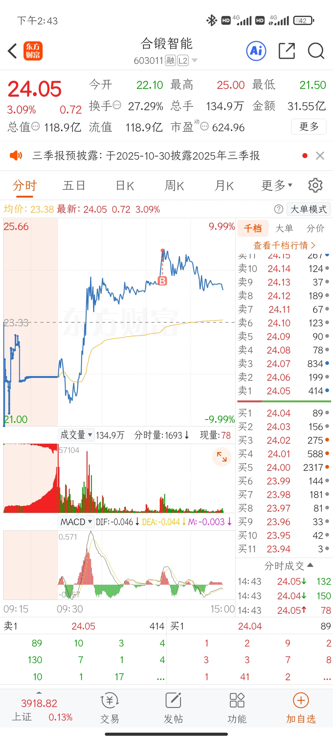 $合锻智能(SH603011)$ 一个字:高处冷。