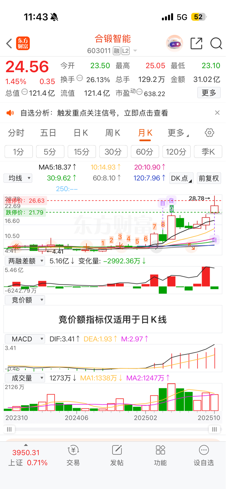 $合锻智能(SH603011)$ 周线来看还可以,最近在补补量防止获利盘太多,量化多拉几次