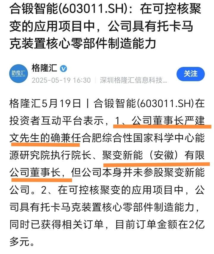 中国“人造太阳”项目由聚变新能(安徽)有限公司承建,合锻智能董事长严建文兼任聚变