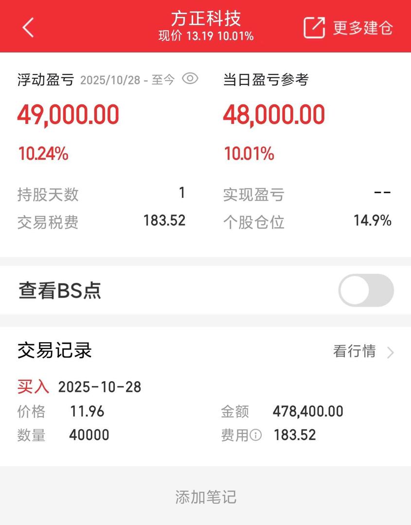 方正科技昨天直接封板涨停,鹏哥吃到肉了!它属于 P C B 板块,本来就是AI算力的核心环节,还给华为、英伟达供货,正踩在风口上 。控股股东还在认购,明显是对未来有信心。虽然说这票中期逻辑还不错,但是这票鹏哥吃到肉了,算达到既定目标了,今天应该冲高就出掉了。
