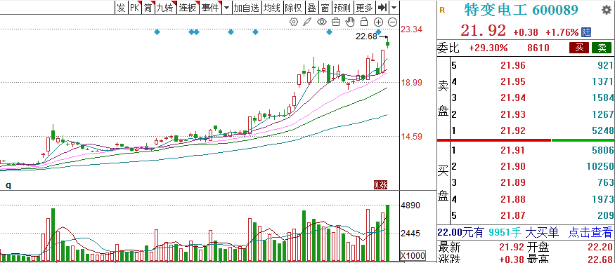 高开高走,有点低于预期,因为今天光伏板块大涨,至少有十多只涨停股,特变电工仅仅是高开高走而已,应该是顺从核电核能这个方向,没有光伏、风电板块强。公司主营输变电业务还是变压器行业龙头,世界领先的新能源系统集成商,为多个核电项目提供变压器等核心设备。技术形态倒没有什么,最悲观的预算是复制10月30日之后的震荡行情而已,但均线系统都是向上的,看涨的总方向不变。