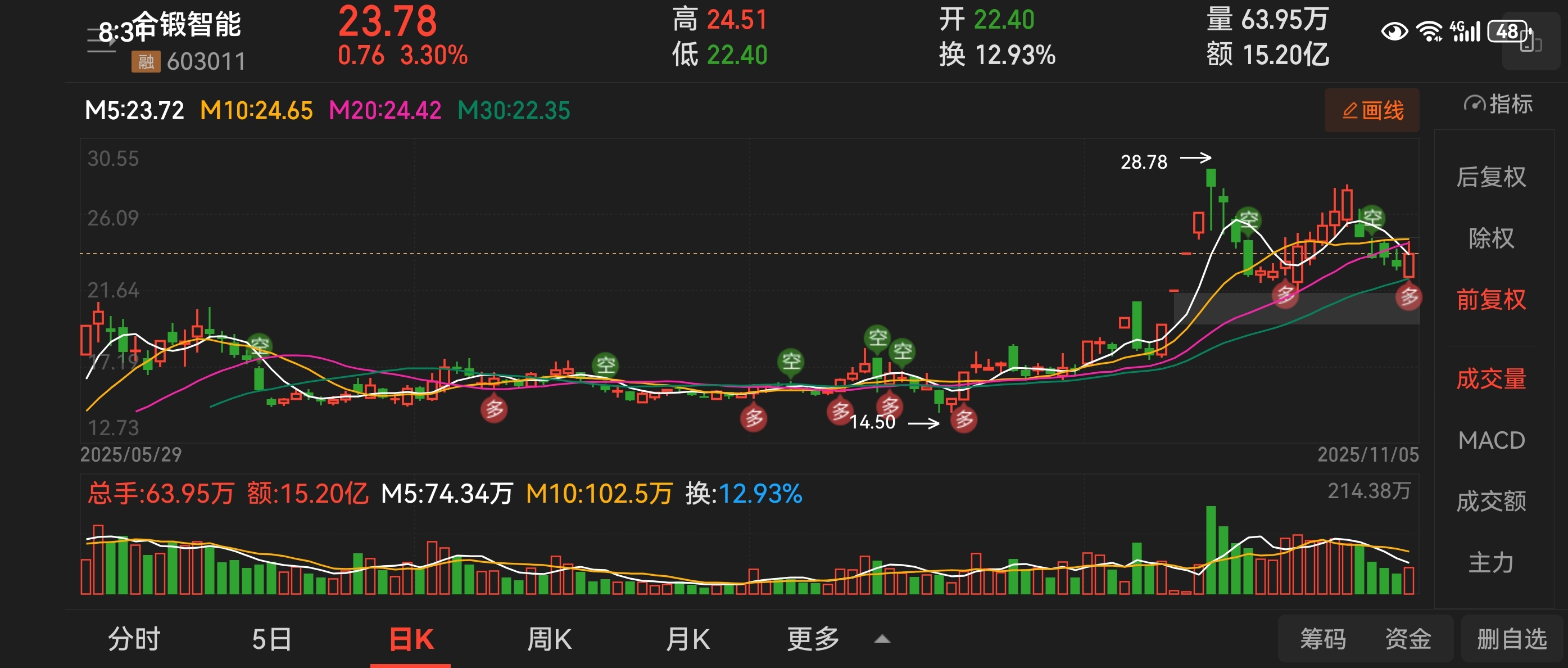 $合锻智能(SH603011)$ 今日盘整支撑位附近反弹,这票简单明了,容易上手!不跌破三十日线就踏踏实实的