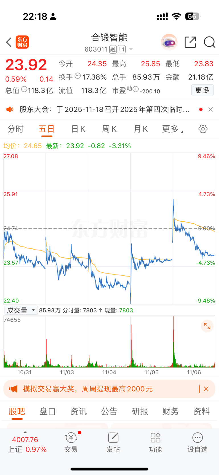 $合锻智能(SH603011)$ 开盘卖尾盘买的套路玩了五天