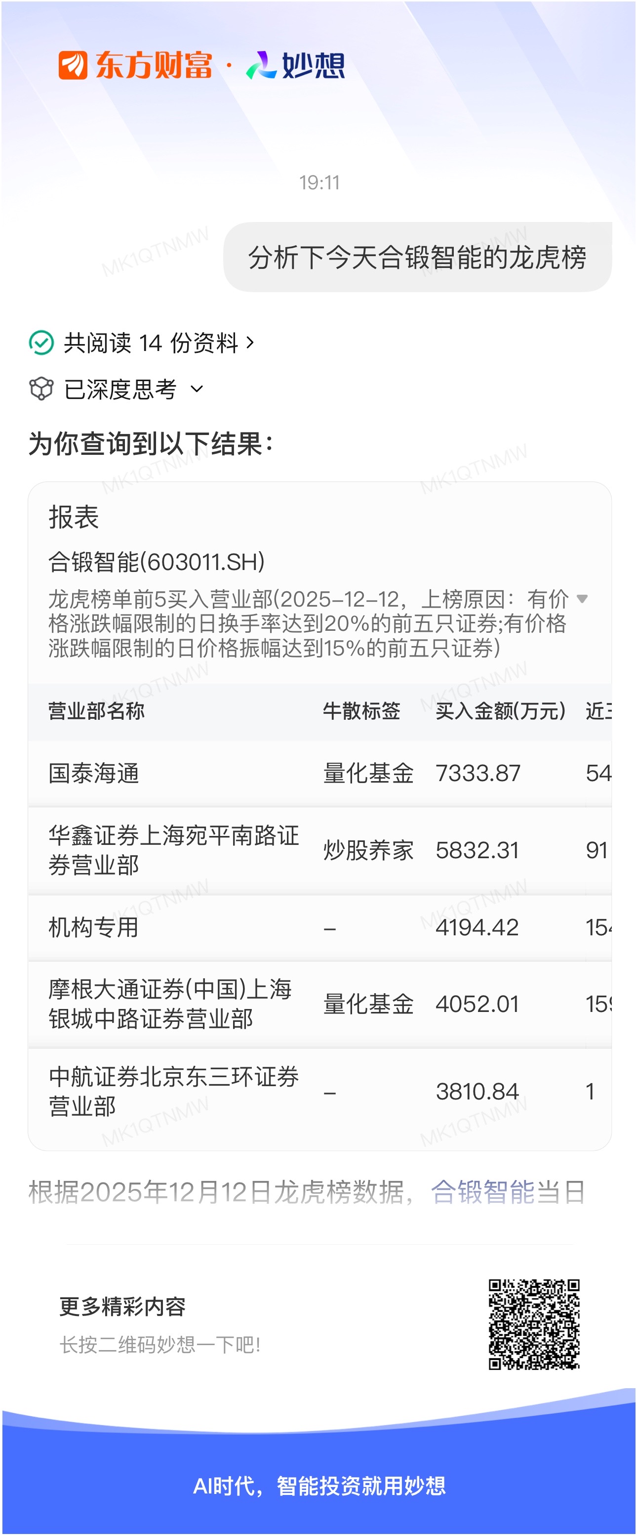 #@妙想,你怎么看?# 妙想一下:分析下今天合锻智能的龙虎榜