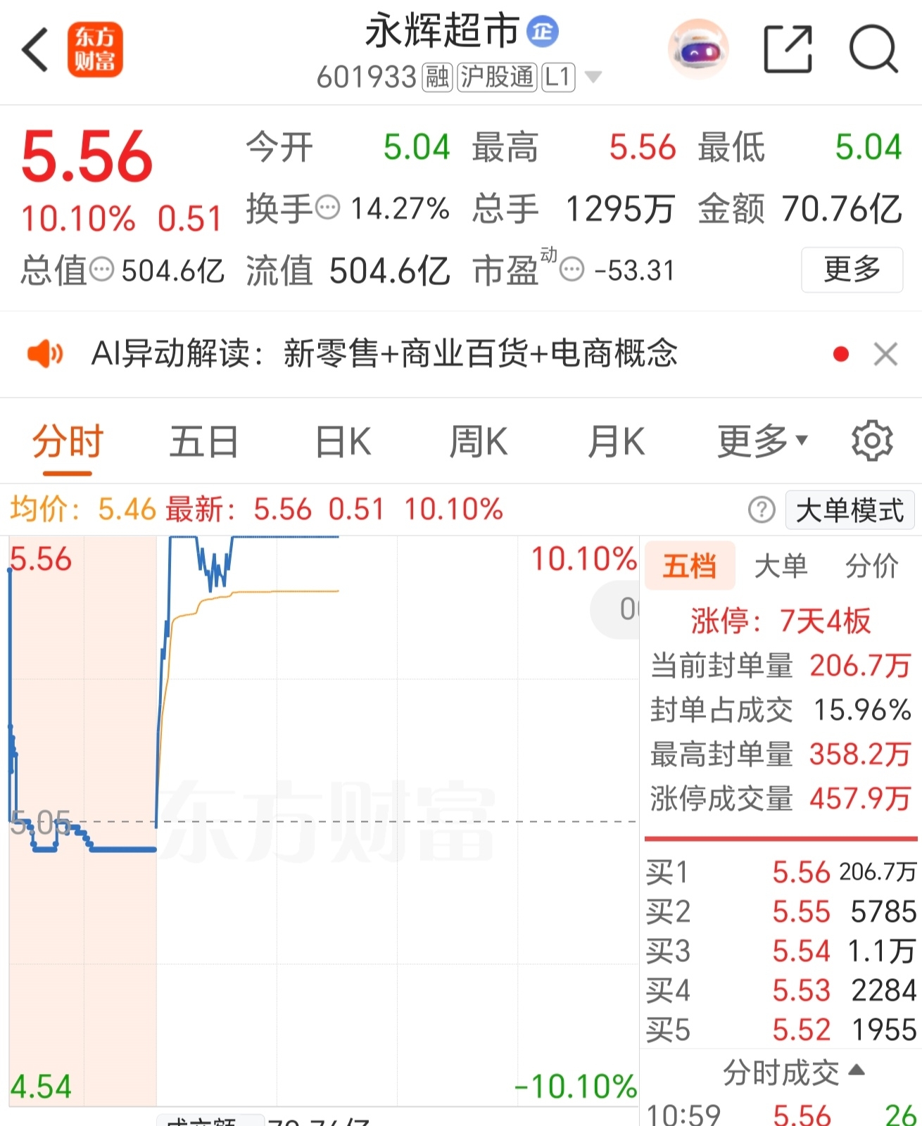 昨日发文上车消费板块前排的永辉超市,今日早盘直接秒板涨停、恭喜老白的粉丝拿下涨停板