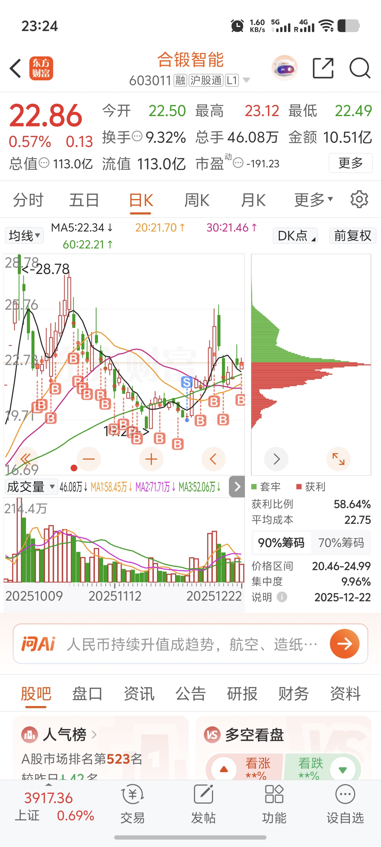 $合锻智能(SH603011)$ 够主力的成本是不是在21左右,我和你一起加仓一起跌的,中途卖了400股