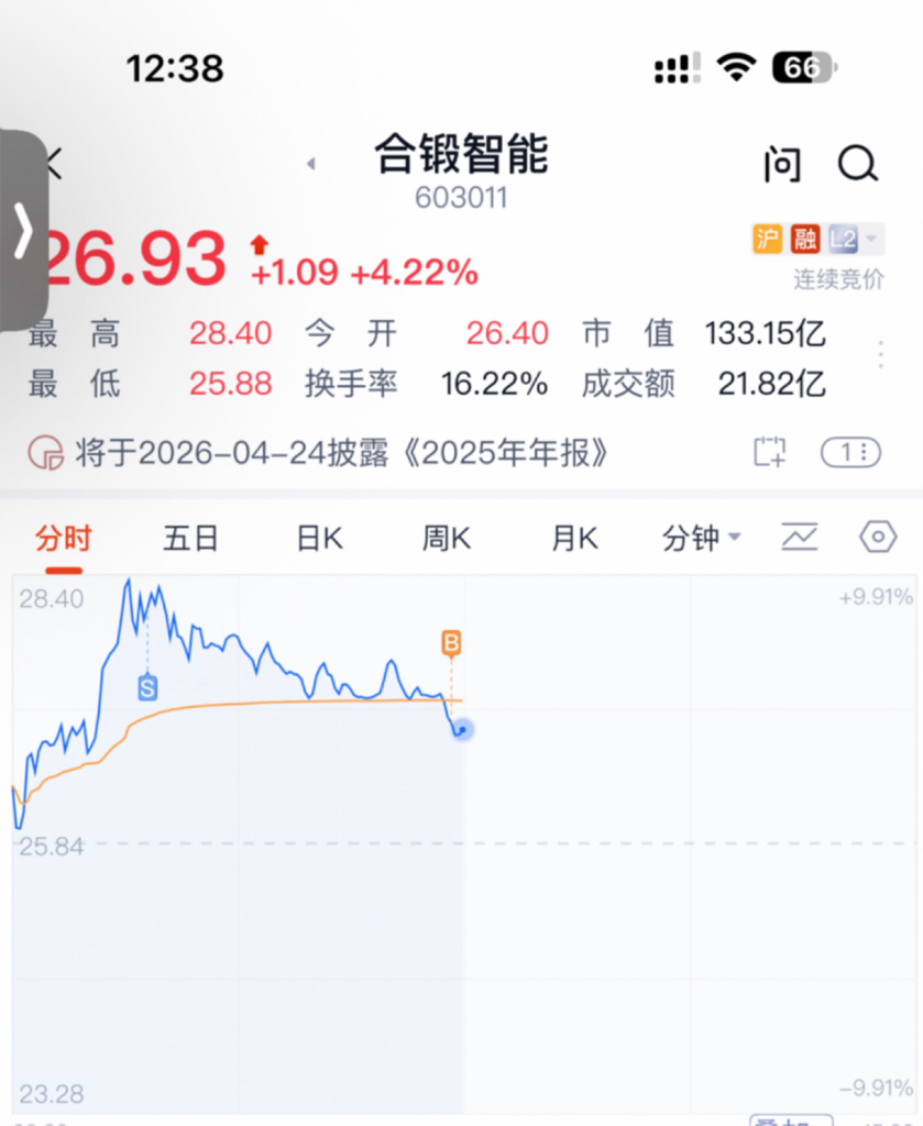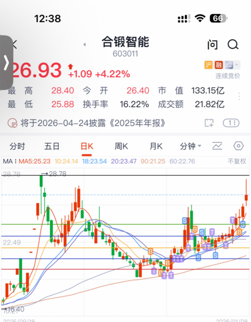$合锻智能(SH603011)$ 好久没谈论这只票了,这票有先手的已经是利润在蹦跑了。若明天能直接破我的上方黑线还有利润空间,若破不了,那我的黑线就是双顶位置,今天在里面做了个T,破了黑线方位站稳还有高点。若破不了就要回调下方绿线找支撑。我现在已经是利润奔跑了。想起来就做个T,没时间就放着不管。