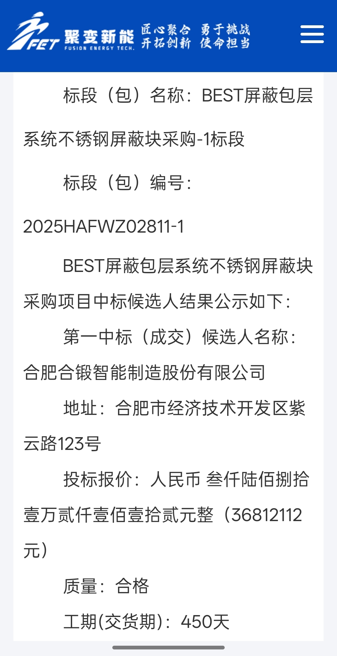 合锻刚中标BEST项目