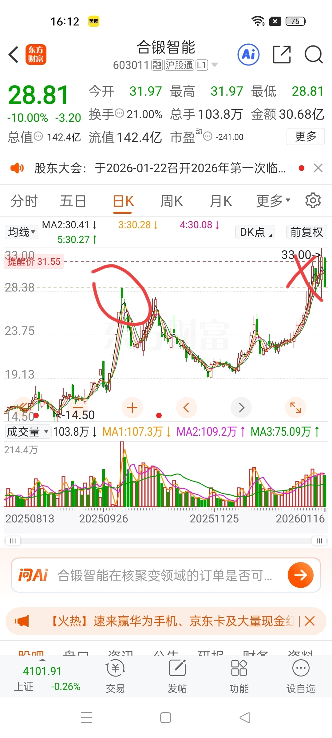 $合锻智能(SH603011)$ 竞价 阴线上补量,周一烂板价格31.55,周四均价31.13,烂板套牢盘没有消化,昨天地板是吸筹,下周一最差也是个拉高做T