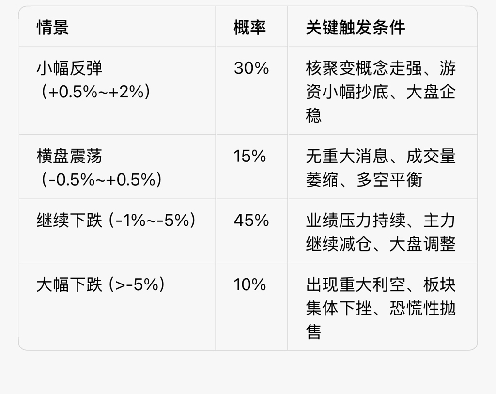 预测一下明天涨跌概率和止盈止损,下跌趋势开启,开盘前设好条件单