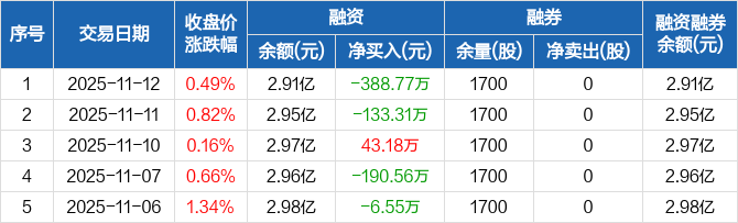 创力集团:融资净偿还388.77万元,融资余额2.91亿元(11-12)