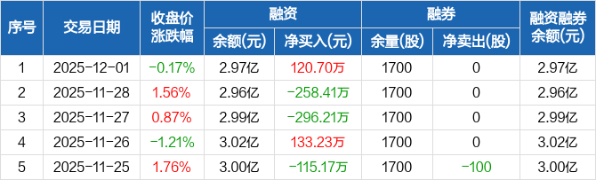 创力集团:融资净买入120.7万元,融资余额2.97亿元(12-01)