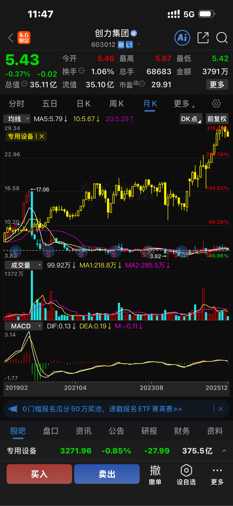 这是创力集团的月K线,黄色的是它的行业线。