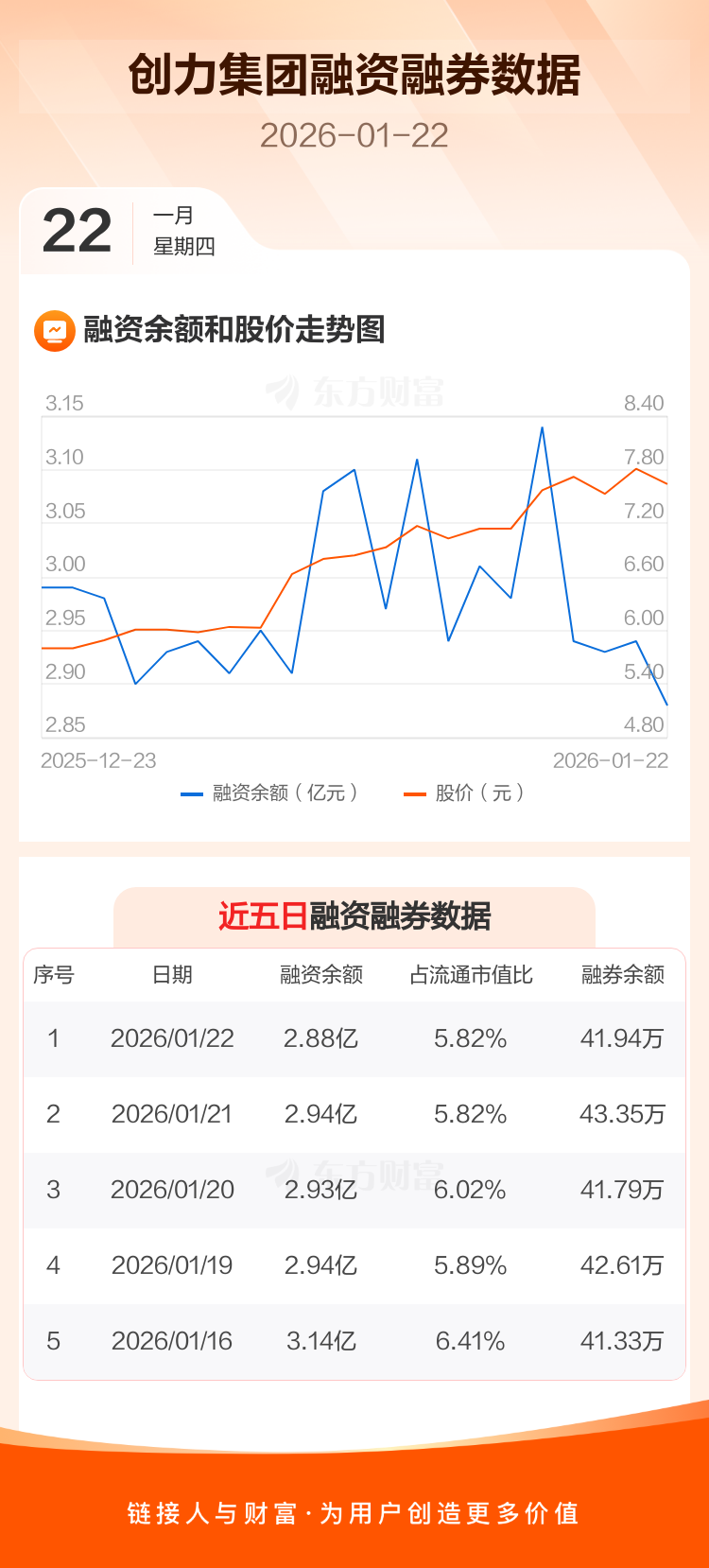 交易所最新数据显示,创力集团于2026年1月22日获融资买入2288.77万元,融资偿还3139.30万元,当日融资净偿还850.53万元。目前,该股融资余额2.88亿,占流通市值比例为5.82%。
