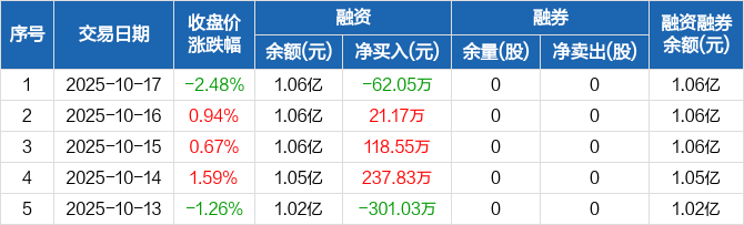 融资方面,当日融资买入715.84万元,融资偿还777.89万元,融资净偿还62.05万元。融券方面,融券卖出0股,融券偿还0股,融券余量0股,融券余额0元。融资融券余额合计1.06亿元。