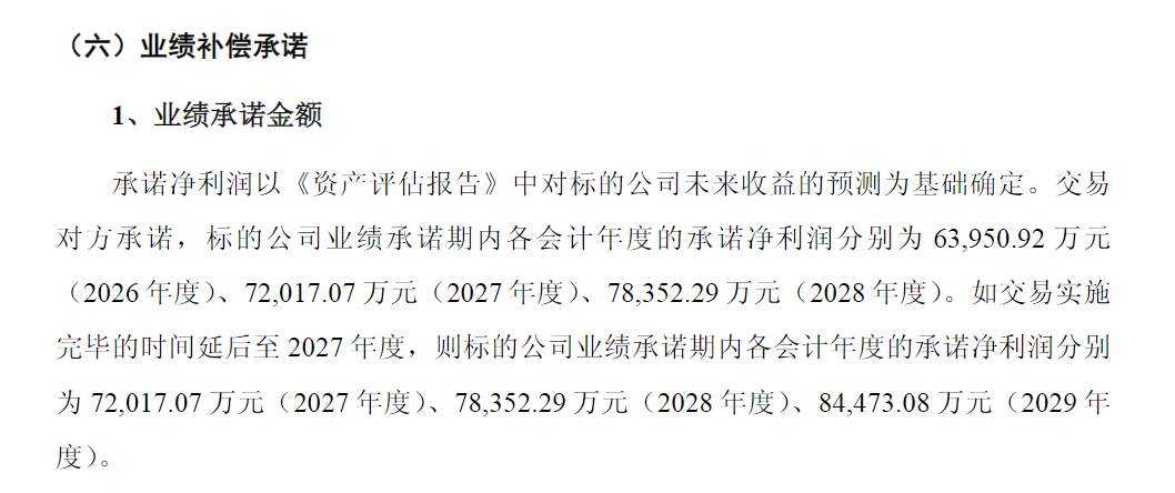 承诺净利润以《资产评估报告》中对标的公司未来收益的预测为基础确定。交易对方承诺,标的公司2026年至2028年各年度承诺净利润分别为约6.40亿元、7.20亿元、7.84亿元。如交易实施完毕的时间延后至2027年度,则标的公司业绩承诺期内各会计年度的承诺净利润分别为2027年度约7.20亿元、2028年度约7.84亿、2029年度约8.45亿元。