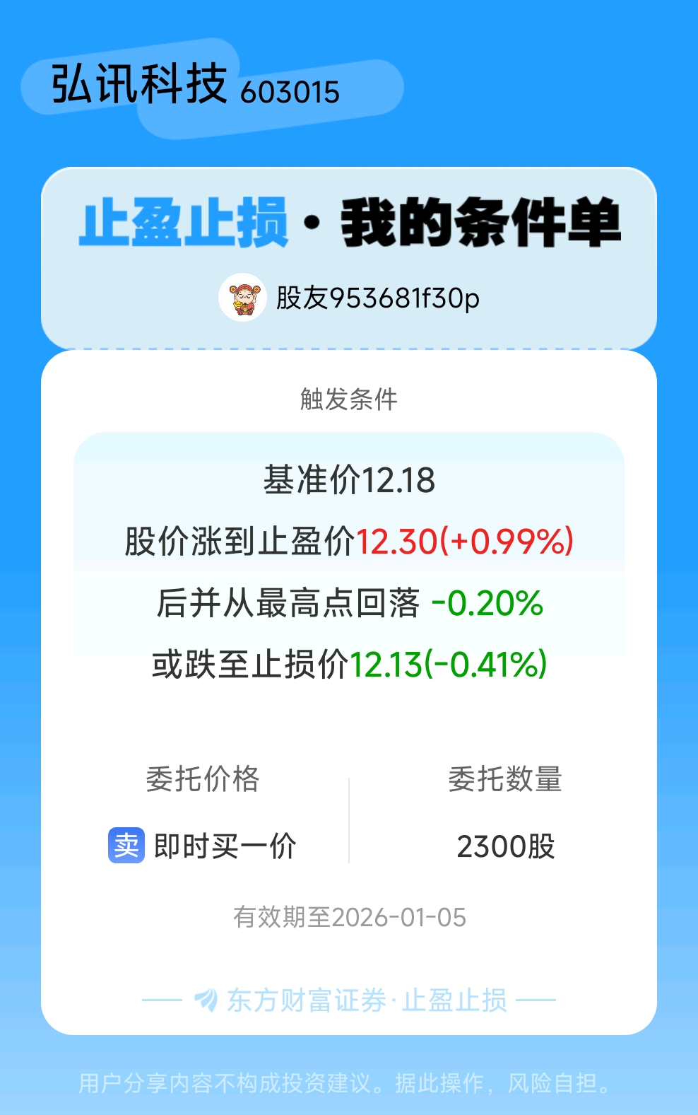 #条件单交流# #止盈止损晒单# 一位股神设置了一个止盈止损条件单,接下来就是见证奇迹的时刻~$弘讯科技(SH603015)$