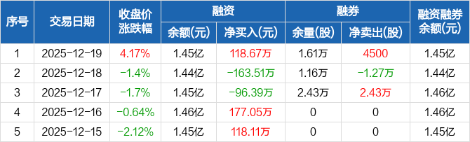 弘讯科技:融资净买入118.67万元,融资余额1.45亿元(12-19)