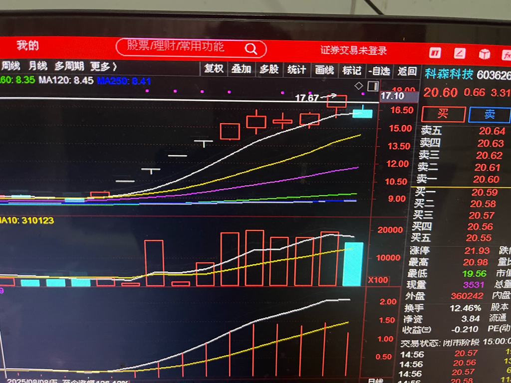 和科森科技603626在8月19日一样的走势,后面三连板和一个冲高回落大阳线
