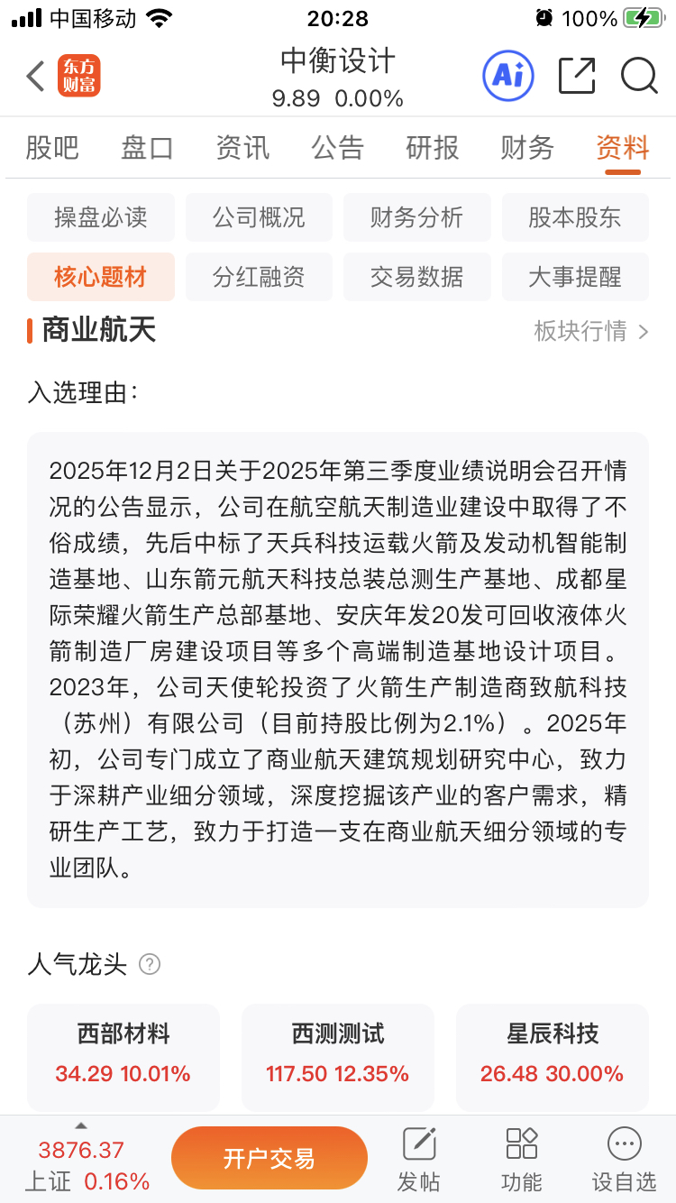 $中衡设计(SH603017)$ 怎么看,感觉也不是蹭概念的,为啥商业航天今天大涨它就是不涨