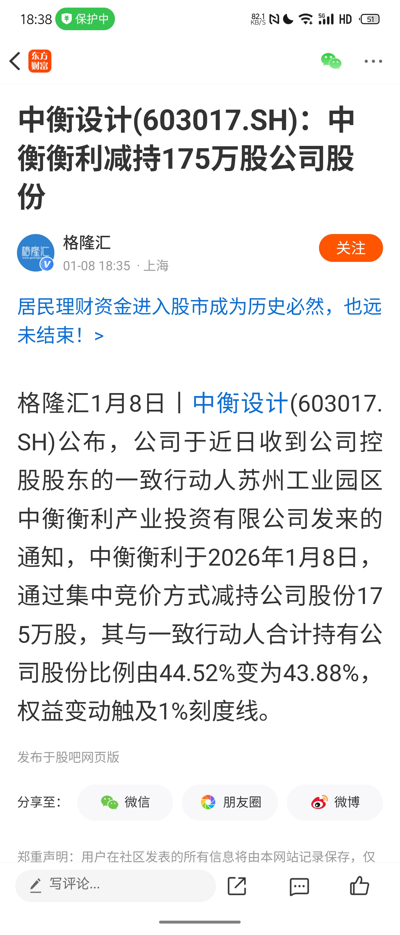 $中衡设计(SH603017)$ 明天大跌。又减持。