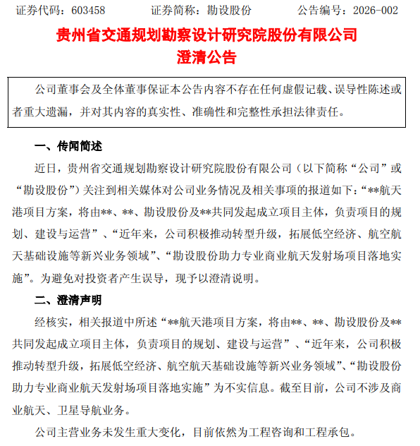 主营业务为工程咨询和工程承包的勘设股份,股价也于2025年12月下旬启动上涨,至今有3个交易日以涨停收盘。不过,勘设股份1月8日晚间发布公告澄清,近日有媒体报道称“**航天港项目方案”将由勘设股份负责项目的规划、建设与运营,勘设股份助力专业商业航天发射场项目落地实施等。相关内容为不实信息。截至目前,公司不涉及商业航天、卫星导航业务。