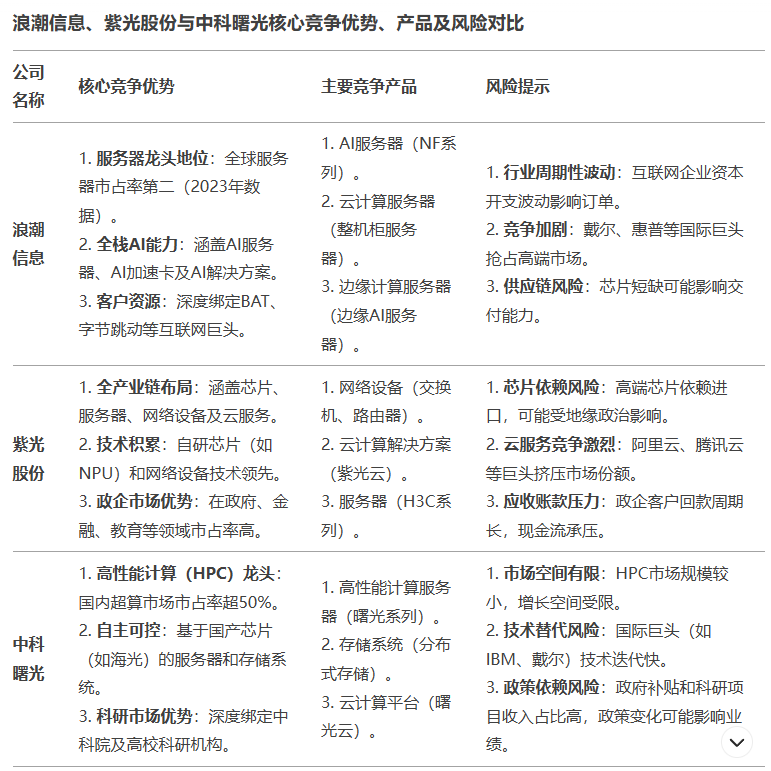 综上所述,浪潮信息、紫光股份和中科曙光在盈利质量方面各有特点。浪潮信息在市场竞争中面临盈利挑战,需要优化成本和费用结构;紫光股份凭借技术优势保持相对稳定的盈利,但需加强费用控制;中科曙光通过技术创新实现盈利提升,但要注意现金流管理和研发投入的平衡。在未来的发展中,三家公司都需要密切关注行业动态,不断调整经营策略,提升自身核心竞争力,以适应市场变化,实现可持续发展。