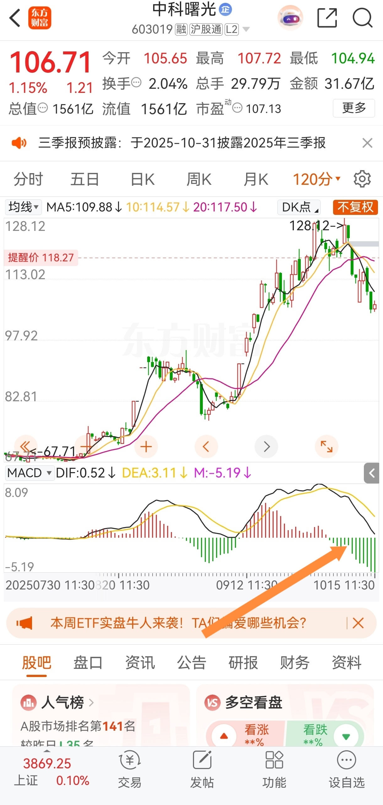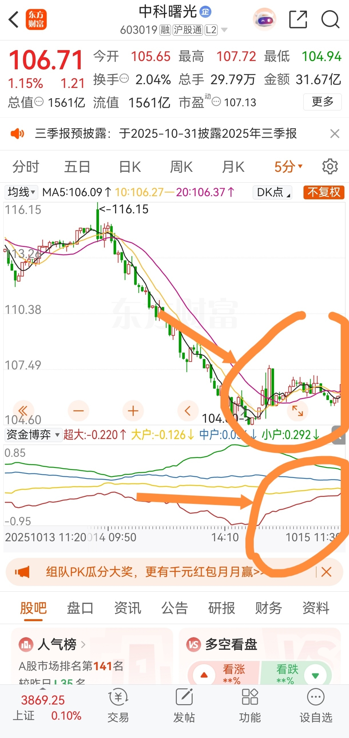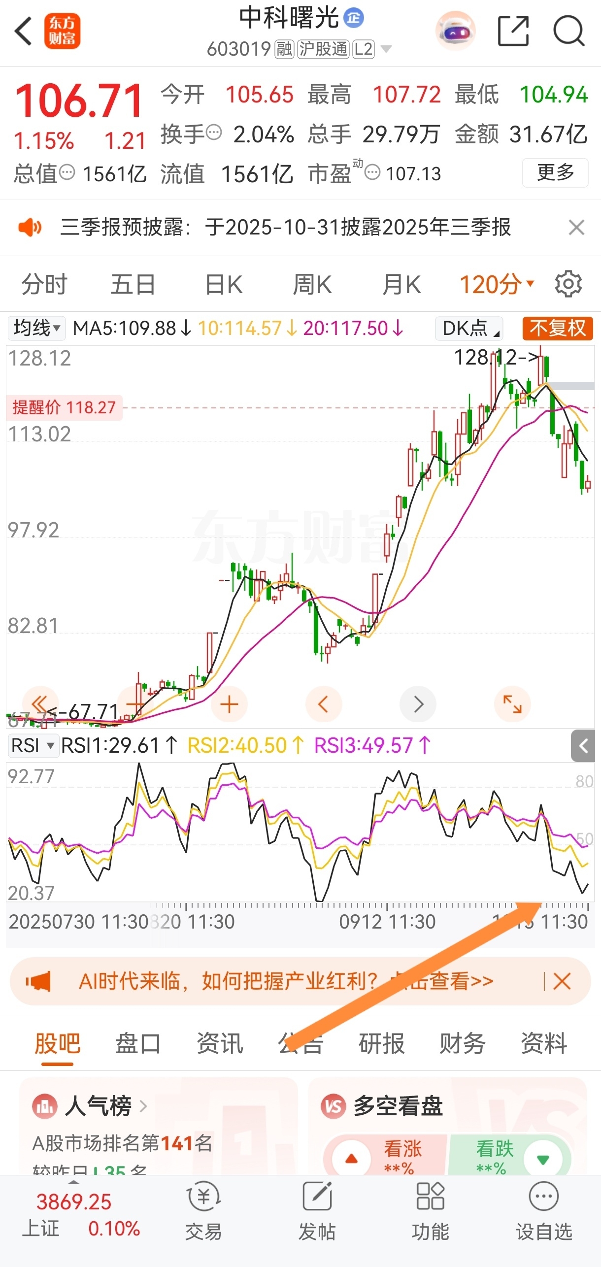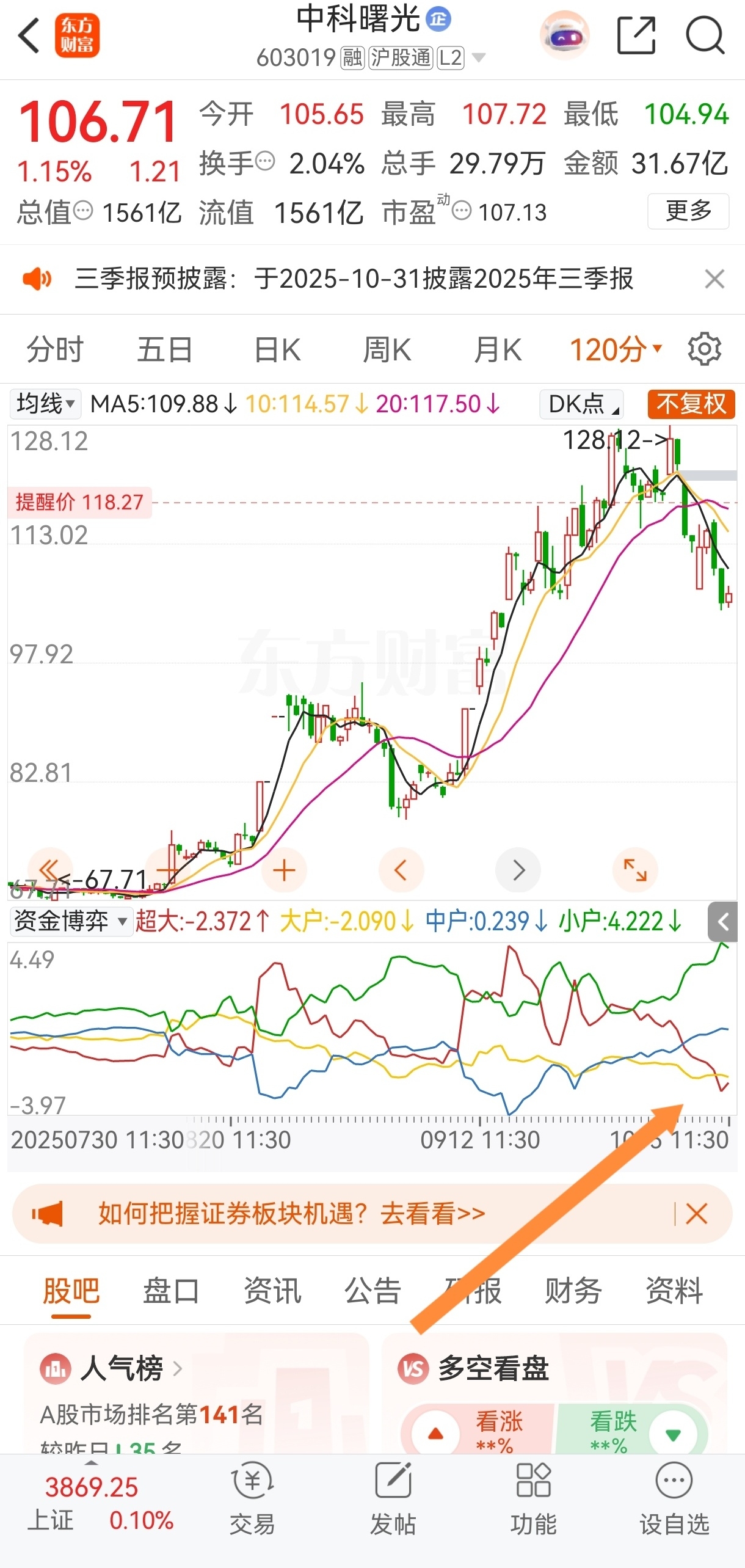 $中科曙光(SH603019)$ 从120分钟MACD准备到0轴附近,可以对比一浪调整也是到0轴附近迎来反弹。RSI,资金博弈也到了比较低的位置!5分钟资金博弈红色线主力在低位偷偷建仓吃货了!