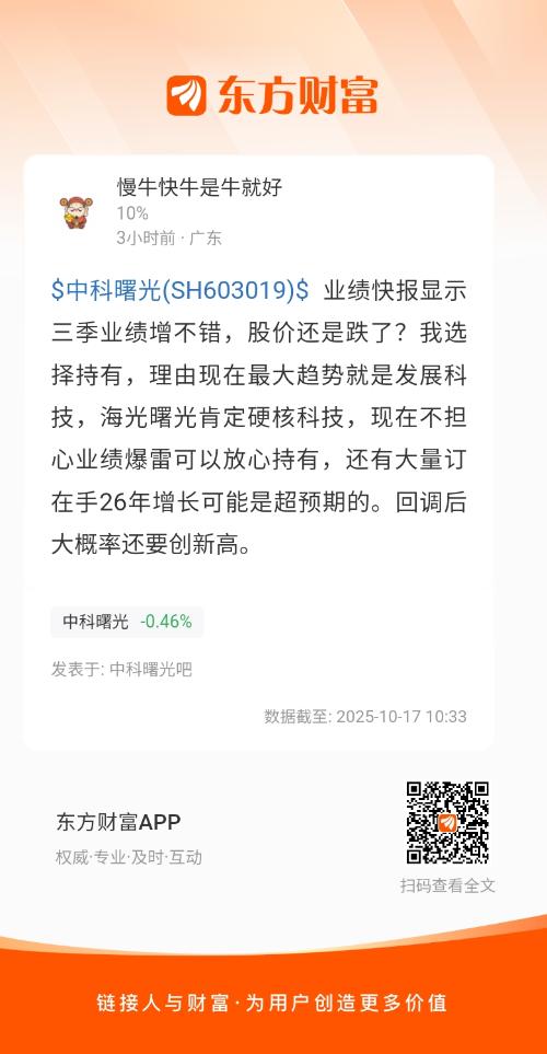$中科曙光(SH603019)$ 业绩快报显示三季业绩增不错,股价还是跌了?我选择持有,理由现在最大趋势就是发展科技,海光曙光肯定硬核科技,现在不担心业绩爆雷可以放心持有,还有大量订在手26年增长可能是超预期的。回调后大概率还要创新高。