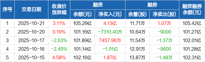 中科曙光融资融券信息显示,2025年10月21日融资净买入4.13亿元;融资余额105.29亿元,较前一日增加4.08%。