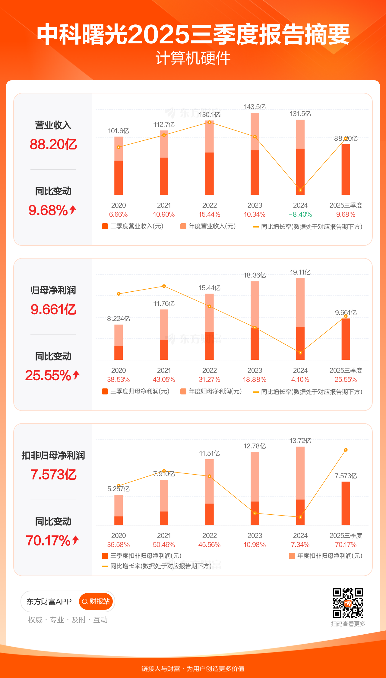 中科曙光10月31日发布2025年三季报显示,公司前三季实现营业收入88.20亿元,同比增长9.68%;归母净利润9.66亿元,同比增长25.55%;扣非归母净利润7.57亿元,同比增长70.17%。