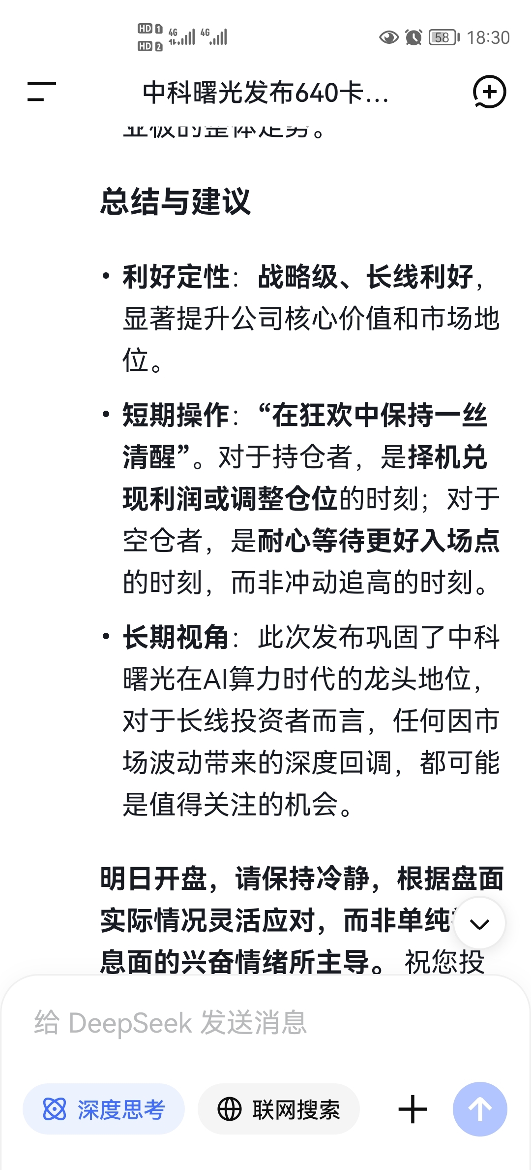 去问了DEEPSEEK,中科今天的超节点单机柜,属于战略级重大利好。耐心持有吧。