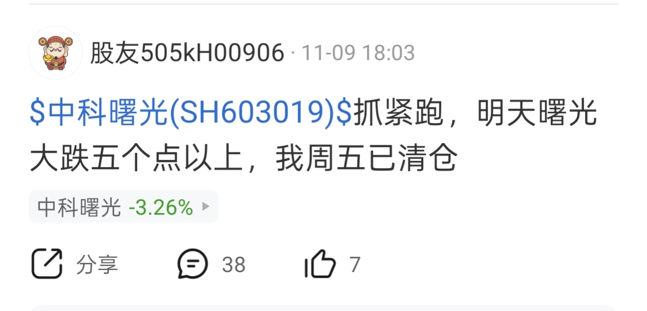 $中科曙光(SH603019)$ 周日我就提醒抓紧跑路了,没人信,评论区还一堆死多头,我再明确说一下,这票现在里面都是融资盘,曙光的股价还会继续腰斩,现在及时止损是最机智之举,下个月你会回来谢我,如果你不服你就继续拿你的真金白银去赌吧。