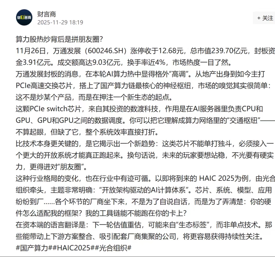 万通做个PCIe交换芯片都能封板,市场认的不是单品,是它在生态里的卡位,照这个逻辑,曙光这种“组局”的是不是该动了?