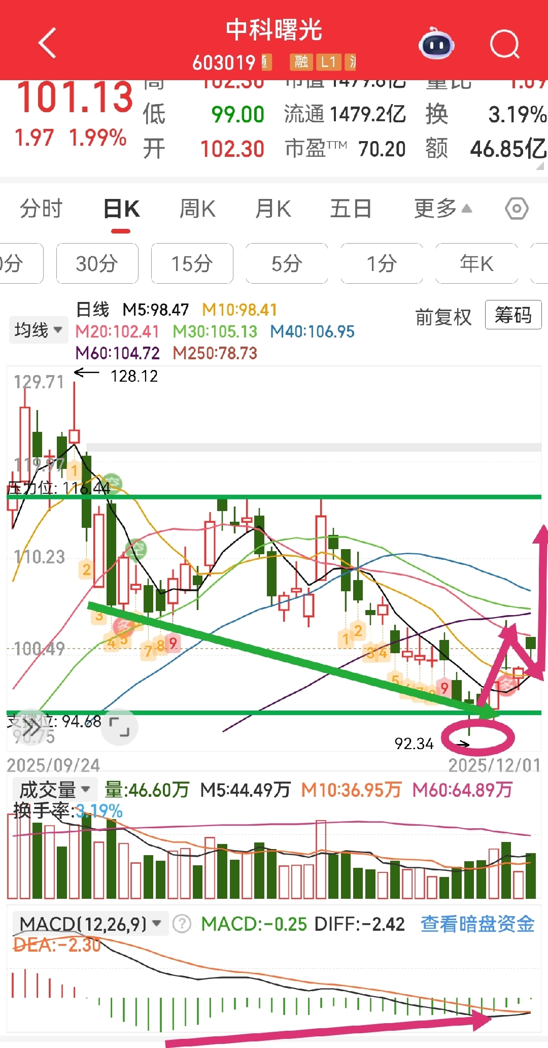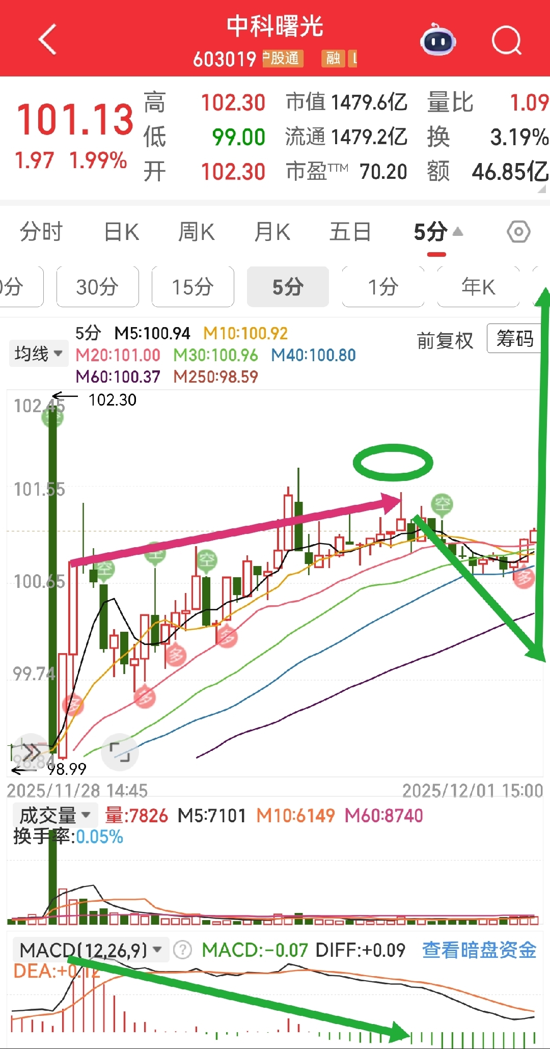 $中科曙光(SH603019)$ 股价运行在智能撑压线之间,出现了日k线级别的下跌背离,该走上升周期了!股价冲击压力位116.44元遇阻回落,回抽到智能撑压线的支撑位94.68元获得支撑反弹,今天的反弹并不理想,5分钟k线图,股价和macd出现上涨背离,后市对应会有5分钟级别的调整震荡,调整震荡结束还会重拾升势