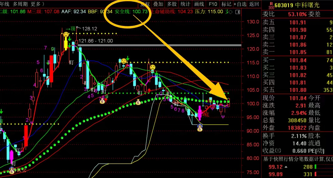 $中科曙光(SH603019)$ 近期进货震荡盘整后,今天小幅拉升回到了安全线100.73位置之上,接下来就看能否站稳吧,能站稳就可以考虑回调结束震荡看涨了,如果站不稳还是谨慎应对,防着再次破位的风险,控制仓位应对。