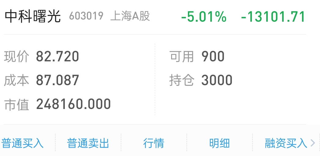 $中科曙光(SH603019)$ 大哥们,我是新韭菜,跌的发慌啊,有没有机会回本