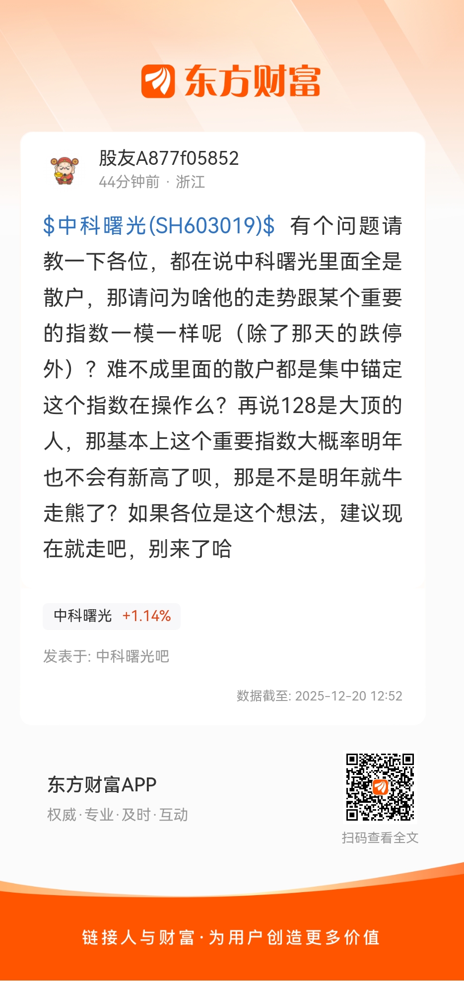$中科曙光(SH603019)$ 有个问题请教一下各位,都在说中科曙光里面全是散户,那请问为啥他的走势跟某个重要的指数一模一样呢(除了那天的跌停外)?难不成里面的散户都是集中锚定这个指数在操作么?再说128是大顶的人,那基本上这个重要指数大概率明年也不会有新高了呗,那是不是明年就牛走熊了?如果各位是这个想法,建议现在就走吧,别来了哈