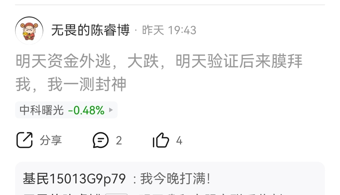 温馨提示: 1.根据《证券法》规定,禁止编造、传播虚假信息或者误导性信息,扰乱证券市场;2.用户在本社区发表的所有资料、言论等仅代表个人观点,与本网站立场无关,不对您构成任何投资建议。用户应基于自己的独立判断,自行决定证券投资并承担相应风险。《东方财富社区管理规定》