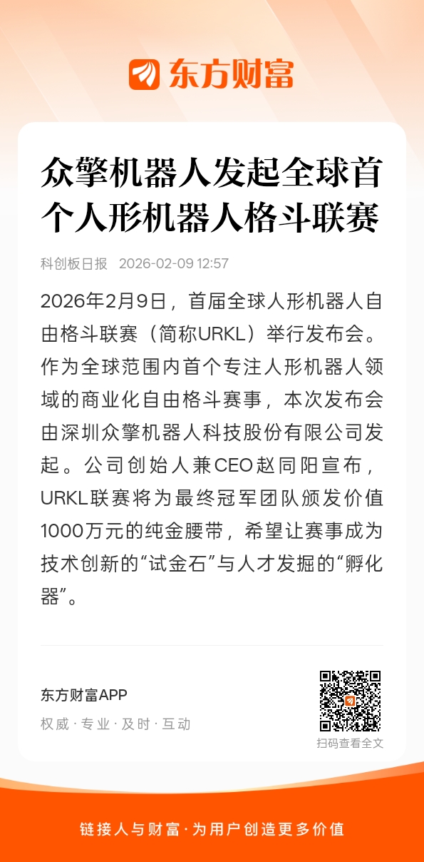 2026年2月9日,首届全球人形机器人自由格斗联赛(简称URKL)举行发布会。作为全球范围内首个专注人形机器人领域的商业化自由格斗赛事,本次发布会由深圳众擎机器人科技股份有限公司发起。公司创始人兼CEO赵同阳宣布,URKL联赛将为最终冠军团队颁发价值1000万元的纯金腰带,希望让赛事成为技术创新的“试金石”与人才发掘的“孵化器”。