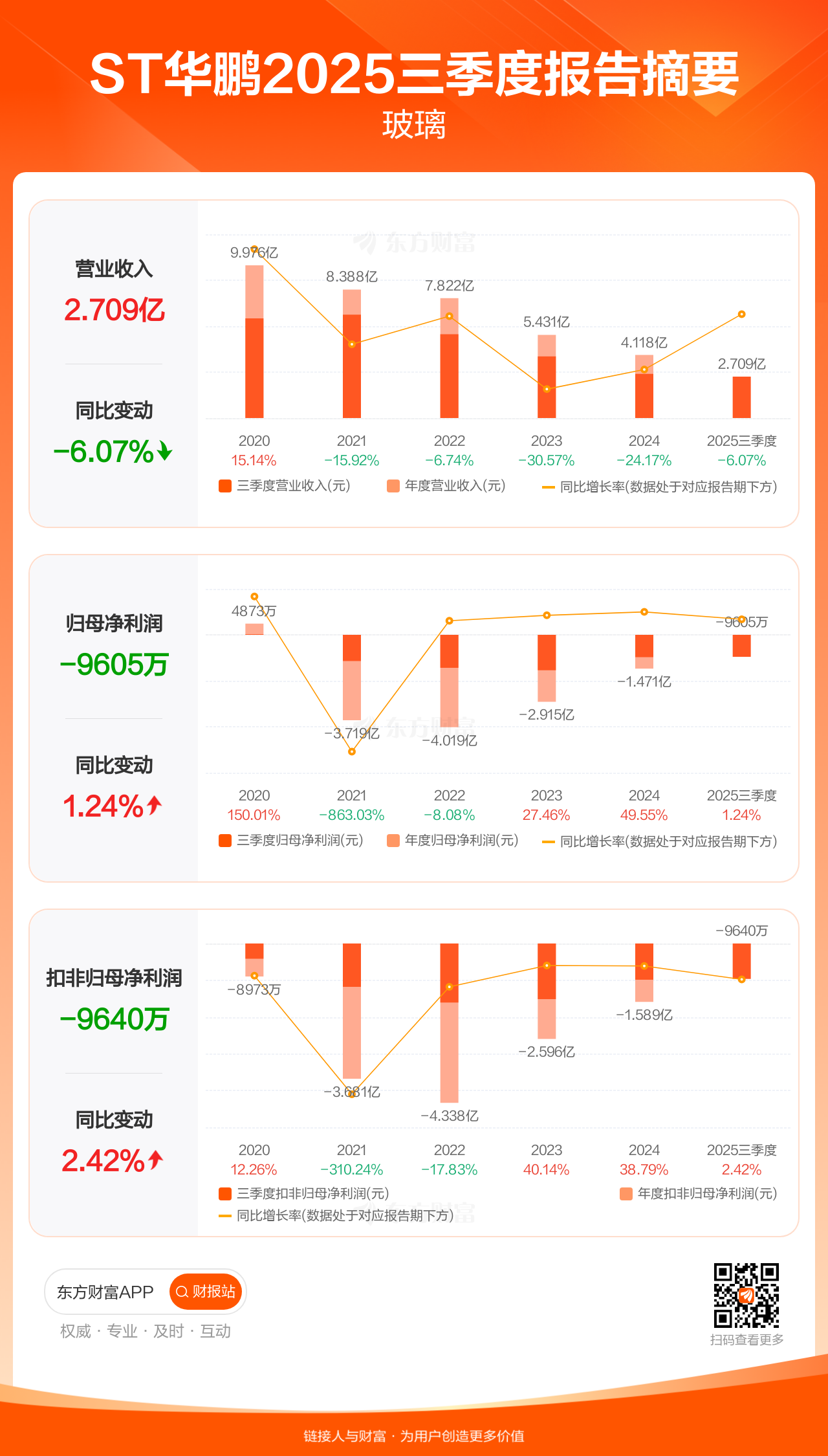 ST华鹏10月29日发布2025年三季报显示,公司前三季实现营业收入2.71亿元,同比下滑6.07%;归母净利润-9604.73万元;扣非归母净利润-9640.38万元。