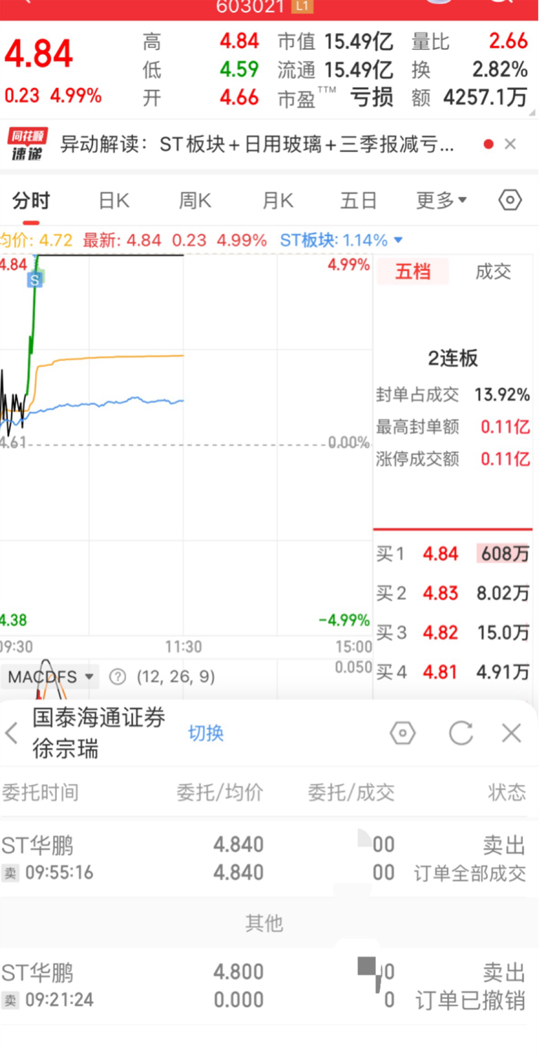 $ST华鹏(SH603021)$ 拿了一个多月,折磨了我一个月。回本清仓了,这主力经常玩涨停跌停的把戏。其余时间就阴跌。