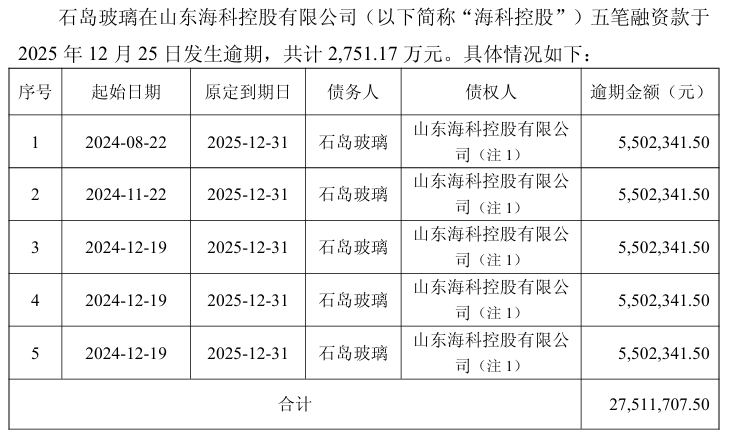 12月26日,ST华鹏(603021)发布公告,公司的全资子公司石岛玻璃因现金流压力较大,未能按时履行部分债务偿还义务。石岛玻璃在山东海科控股的五笔融资款于2025年12月25日发生逾期,逾期金额合计为2751万元。