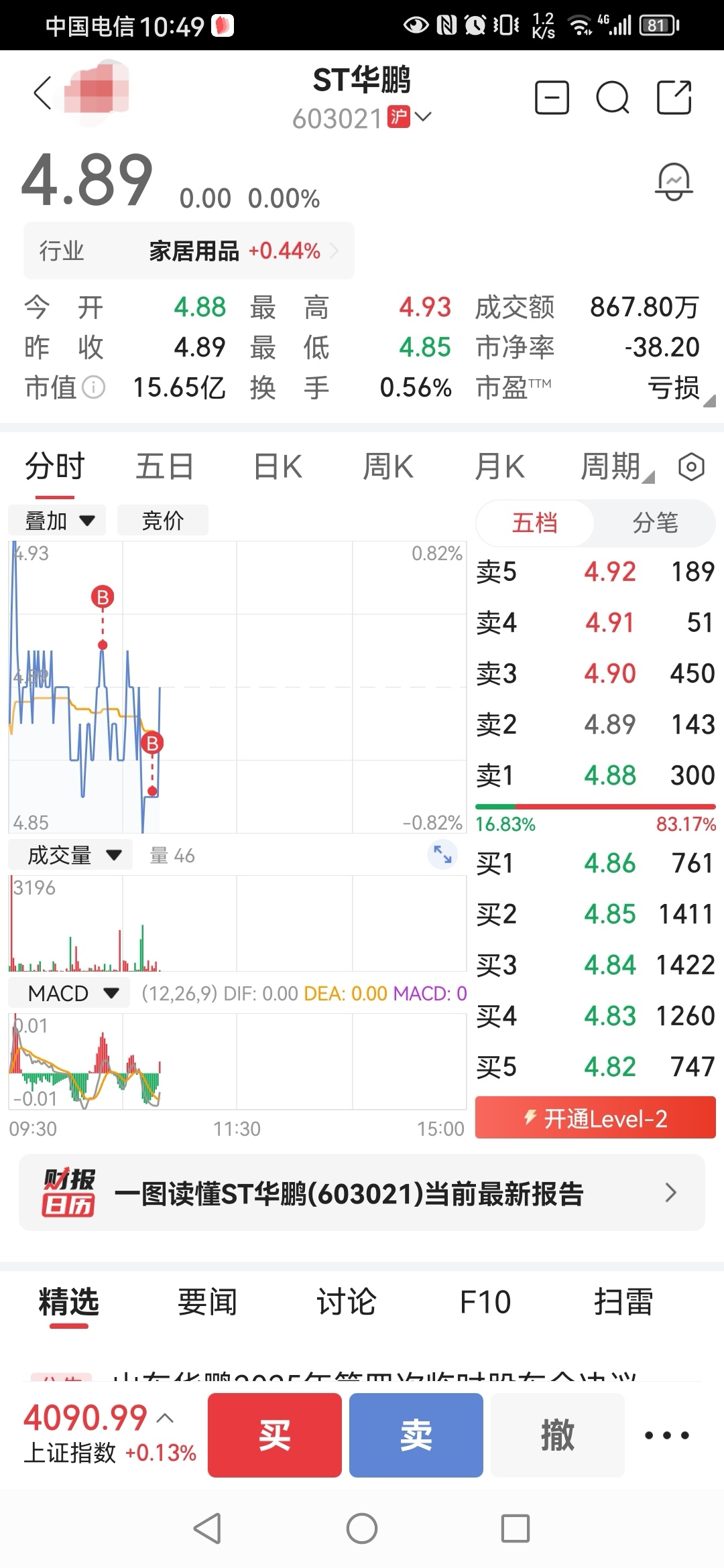 $ST华鹏(SH603021)$ 加到一半仓。外面你看看涨的都是些什么股。看都看不懂。要么一个公告带走的。要么涨到市值高到吓人。。10几亿市值的没得几个了。还有重整重组预期的更没得几个了。留一半仓以防立案调查到时候也不慌。沐邦立案重整现在不一样涨。