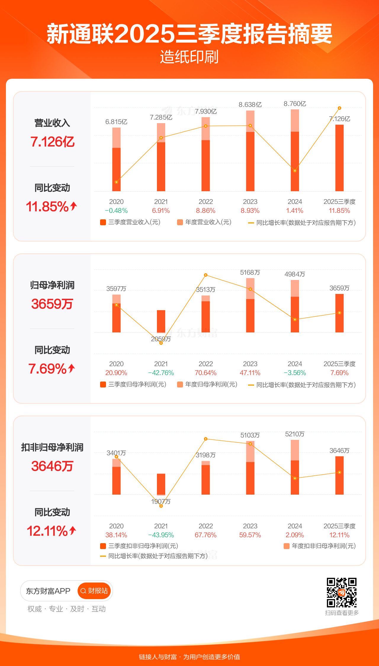 新通联10月29日发布2025年三季报显示,公司前三季实现营业收入7.13亿元,同比增长11.85%;归母净利润3658.73万元,同比增长7.69%;扣非归母净利润3646.46万元,同比增长12.11%。