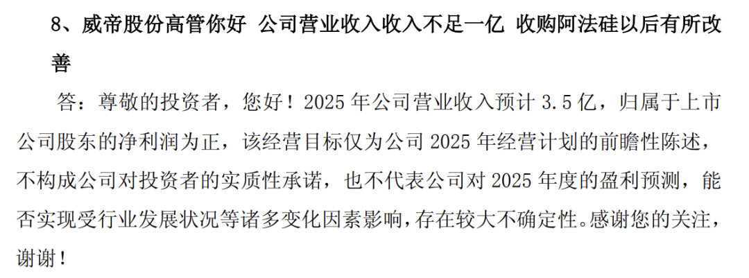 威帝股份还在今年5月份的业绩说明会上展望,2025年公司营业收入预计3.5亿元,归母净利润为正。不过,今年前三季度,公司营收尚只有1.1亿元。