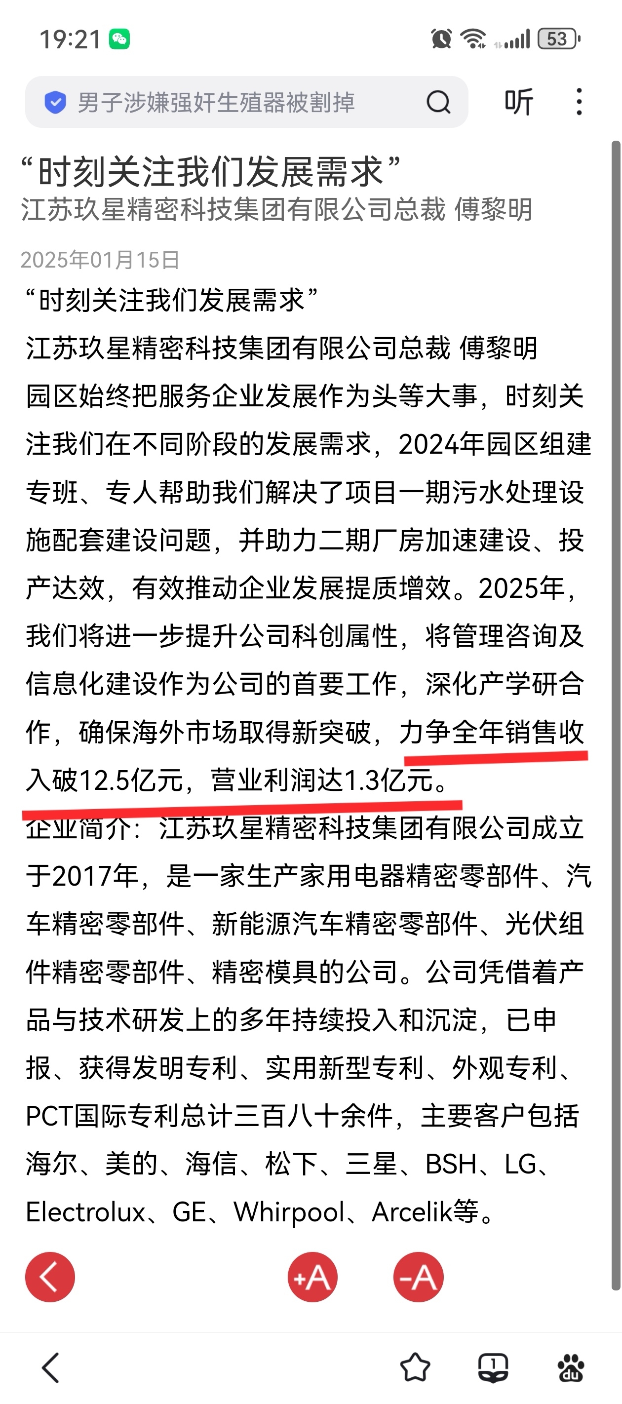 $威帝股份(SH603023)$ 泰州日报:玖星精密2025年营收12.5亿,净利润1.3亿