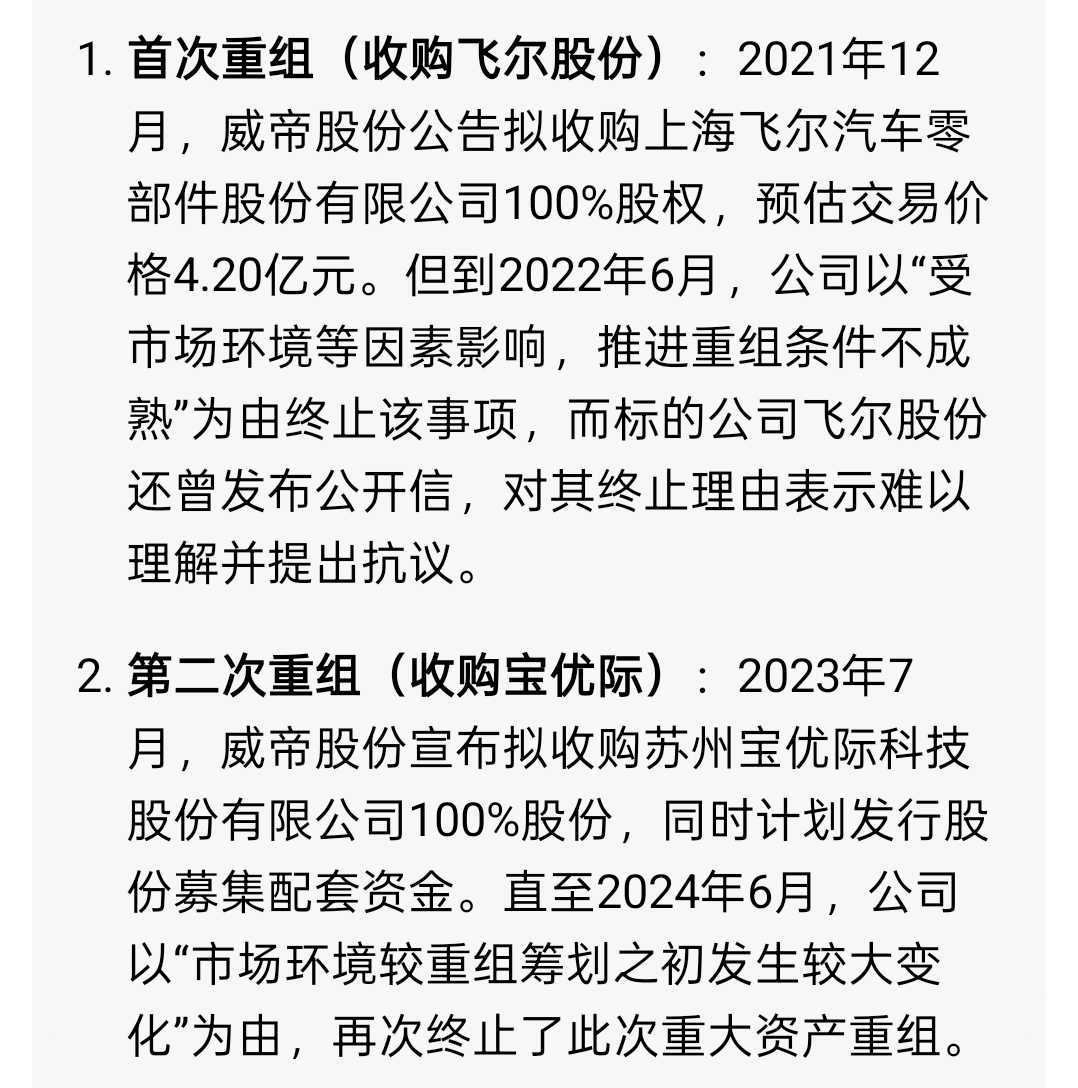 $威帝股份(SH603023)$ 只能说这个公司高层给人的感觉就是喜欢出尔反尔,大概率没多大格局,可能也是没钱所致,利用重组消息已经骗过两次人了,现在又来!