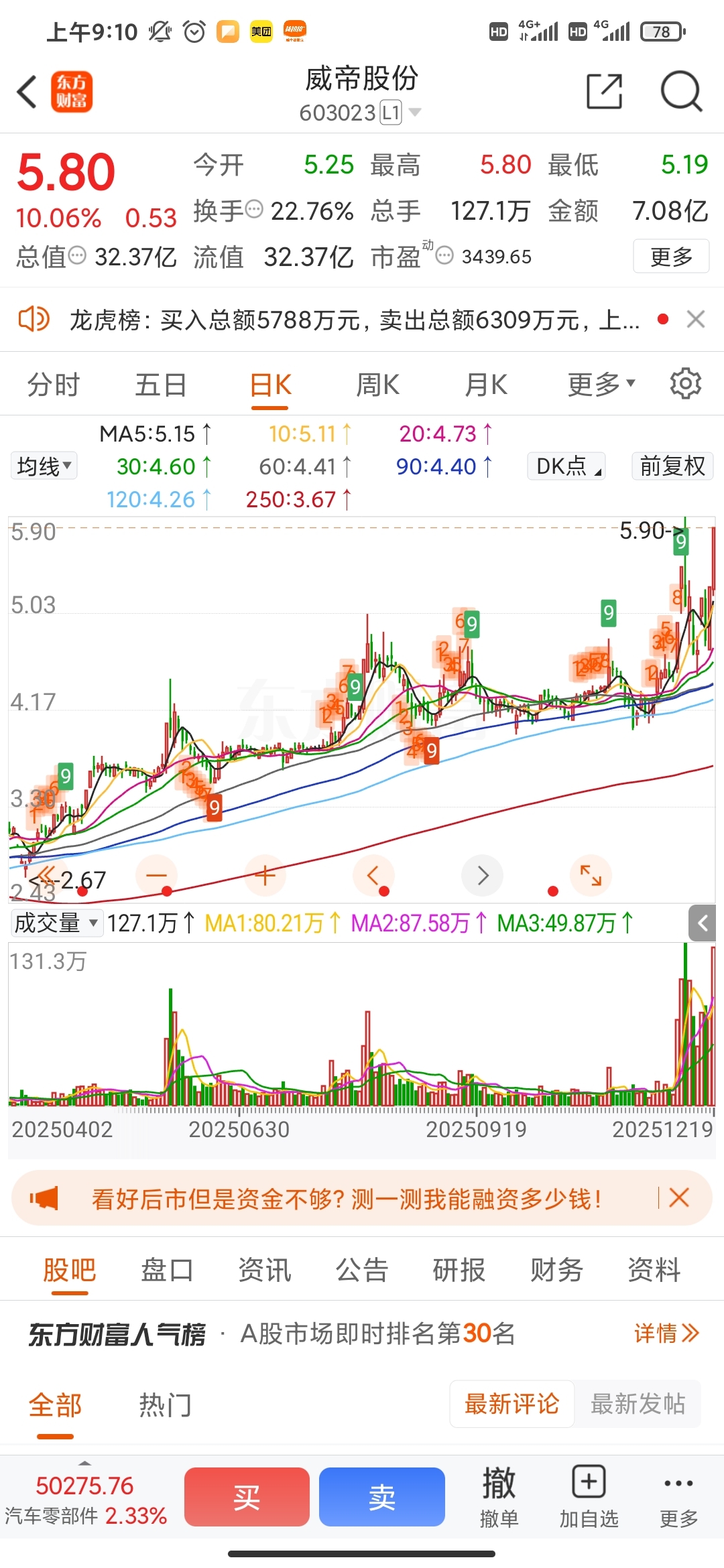 $威帝股份(SH603023)$